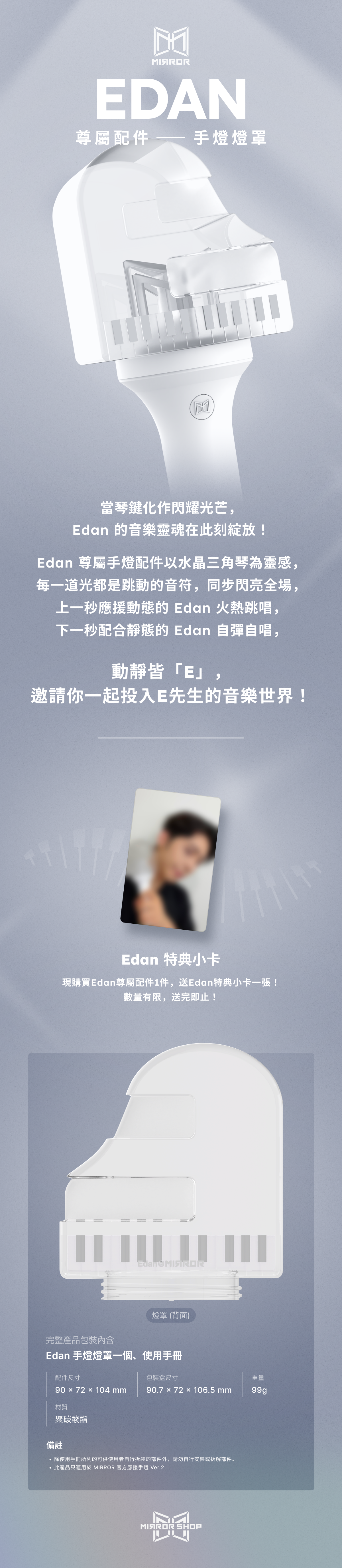 - 現購買Edan尊屬配件1件,送Edan特典小卡一張!數量有限,送完即止!